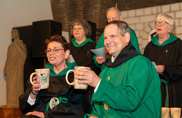 De feestelijke bijeenkomst vond dit jaar plaats in de kapel van Vincentius. Na de woorden van abt Wim van Kempen volgde de ceremonie. Nadat René en Mandy de belofte afgelegd hadden om een goede broeder te zijn, kregen zij de bijbehorende versierselen en pijen omgehangen. De nieuwe burgemeester met haar echtgenoot, Fleur en Floris Gräper waren aanwezig. Voor hen het eerste evenement wat zij, na haar installatie tien dagen geleden, in Udenhout meemaakten. Zij sprak de nieuwe broeders toe, gevolgd door de voorzitter van de dorpsraad, prins Carnaval, de voorzitter raad van bestuur van Prisma en de voorzitters van scouting Udenhout en het Winterparadijs. Kern van iedere toespraak was de waardering, felicitatie en dankzegging voor alles wat Mandy en René iedere dag weer doen. Natuurlijk was er toen gelegenheid om hen te feliciteren en het glas te heffen en gezellig met elkaar nog enige tijd door te brengen.