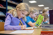 De Schrijfstudio is in principe bedoeld voor kinderen uit groep 6, 7 en 8. Bij deze groep van tien kinderen waren zelfs drie dappere meisjes uit groep 4 aangesloten. Vol enthousiasme zijn zij de wereld van verhalen bedenken en schrijven ingestapt.